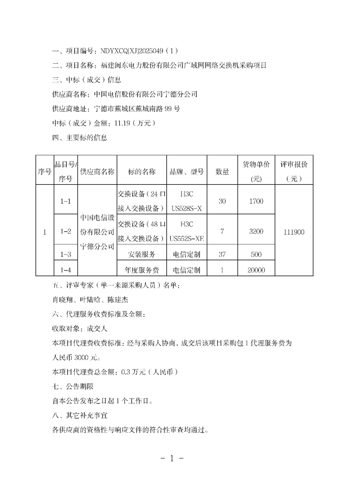 福建閩東電力股份有限公司關于福建閩東電力股份有限公司廣域網(wǎng)網(wǎng)絡交換機采購項目詢價采購成交公告