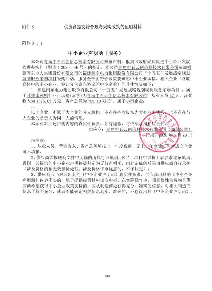 1 | 青島中石云創(chuàng)信息技術有限公司 | 福建閩東電力集團股份有限公司“十五五”發(fā)展戰(zhàn)略規(guī)劃編制服務采購項目 | 福建閩東電力集團股份有限公司“十五五”發(fā)展戰(zhàn)略規(guī)劃編制服務采購項目 | 根據(jù)閩東電力“十四五”發(fā)展戰(zhàn)略規(guī)劃制定的主要任務完成情況進行總結等,具體詳見成交供應商響應文件 | 2026年5月31日前通過采購人組織的評審并提供正式報告,具體按磋商文件要求的時間節(jié)點執(zhí)行 | 成果以電子版和紙質文本兩種形式交付等,具體詳見成交供應商響應文件 |